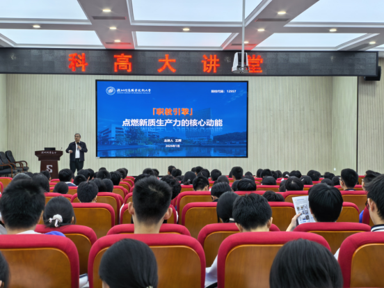 讲座中,王晖校长围绕“新质生产力与职业教育的内在关联”展开深度阐释。他指出,新质生产力的核心是科技创新,而职业教育作为技术技能人才培养的主阵地,正是点燃这一核心动能的关键引擎。结合深圳“20+8”产业集群发展需求,王校长用通俗的语言解析了集成电路、工业软件、人工智能等新兴领域的人才缺口现状,提高了科高学子们对职业教育的传统认知。